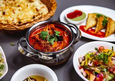Our Indian Menu offers a rich selection of SOUTH & NORTH Indian meals, featuring both VEGETARIAN & NON-VEGETARIAN options, prepared with authentic spices and fresh ingredients for wholesome, satisfying dining.